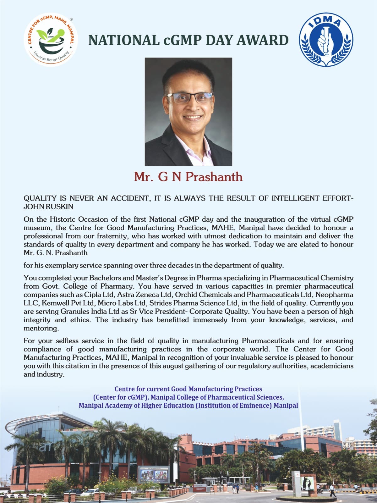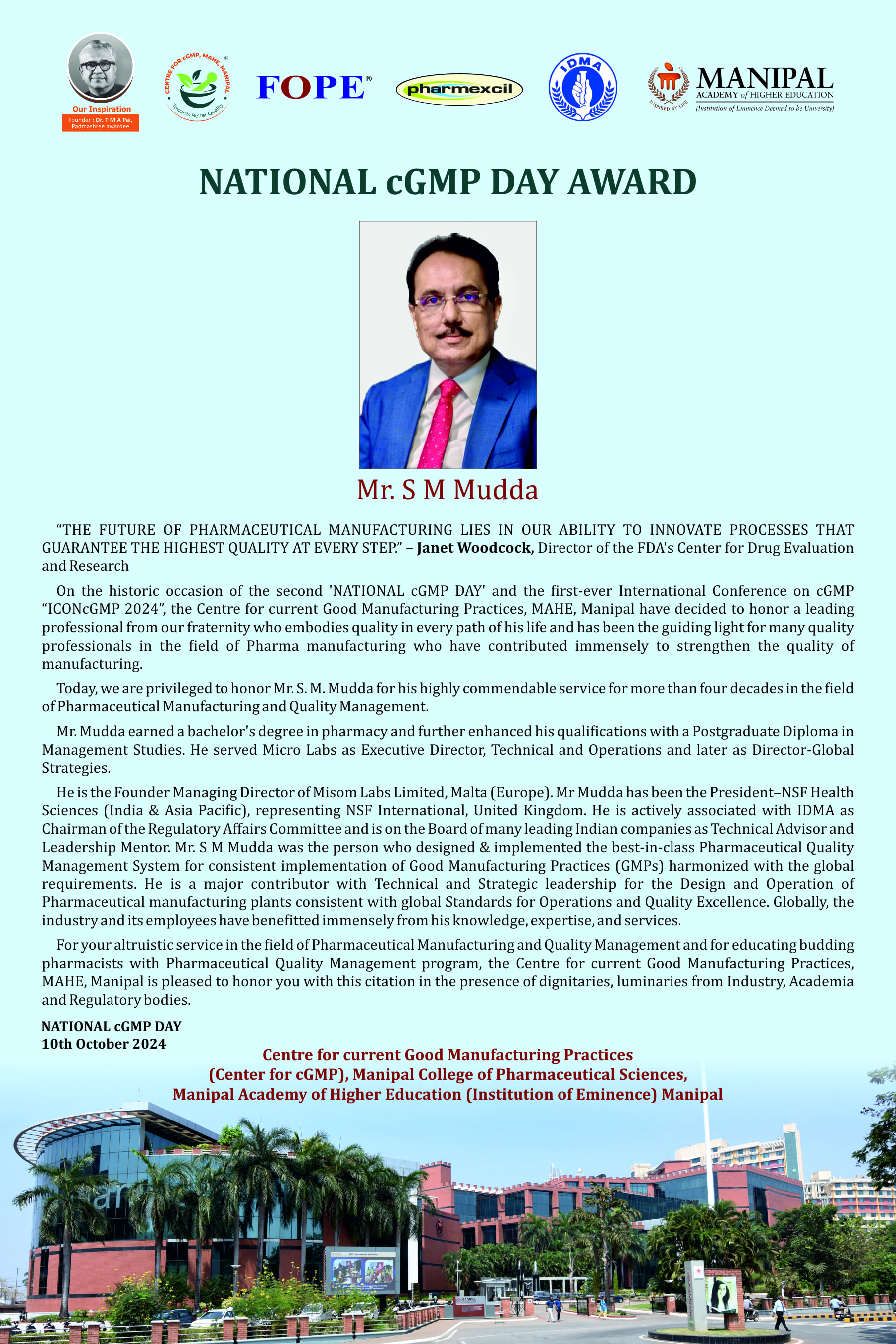 Each year on the momentous occasion of ‘NATIONAL cGMP DAY’ (October 10th), Centre for current Good Manufacturing Practices, Manipal Academy of Higher Education (Institution of Eminence), Manipal, presents the prestigious “NATIONAL cGMP DAY AWARD” to the industry personalities in recognition of their immense contribution to cGMP and services to the pharmaceutical industry.
