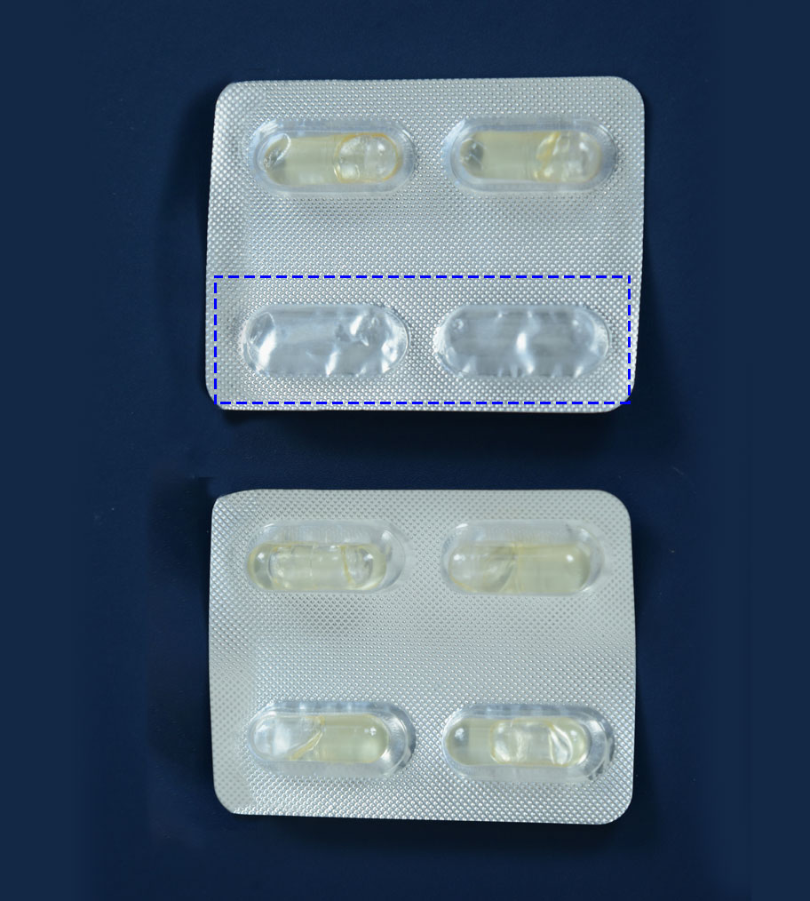 Defects: One capsule sandwiched between the printed foil and PVC film.